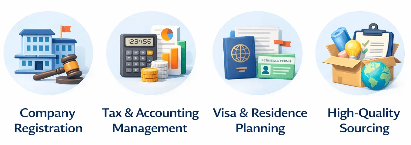 We help entrepreneurs, freelancers, and international founders with a complete, done-for-you solution for company setup, visas, tax, accounting, and sourcing in China.